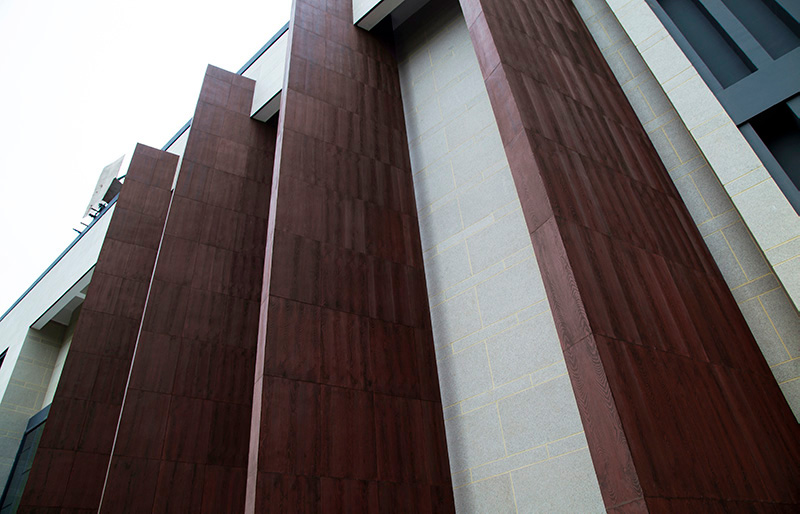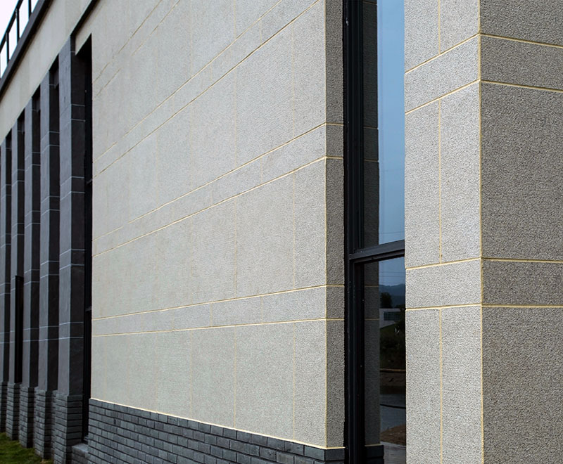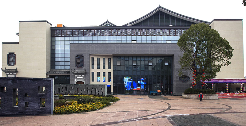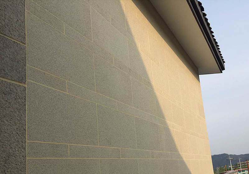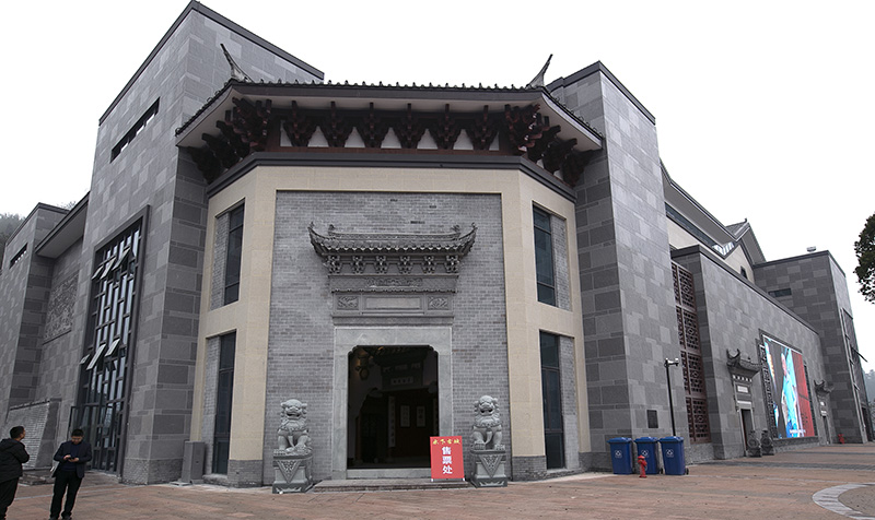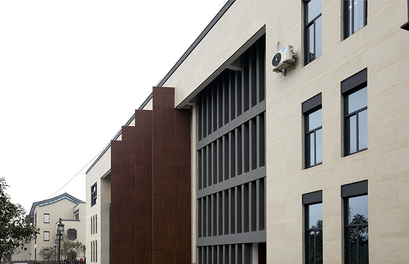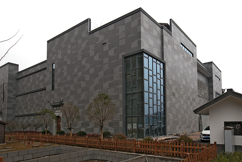 以淺米色花崗巖貼片為主體,正面清灰板巖深淺混搭,完美勾繪出千島湖明清時代深墻大院的風韻。